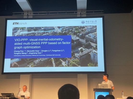 在空间资源勘探利用和GNSS对流层探测等领域的前沿研究成果,引发了与会代表的高度关注和广泛讨论。此外,张秋昭教授、尹智博士后、李龙江博士后和潘诚博士分别在IAG分会场上做了题为《GNSS dual-frequency carrier phase multipath MHM model and its application in real deformation monitoring scenario》、《The geometrical features of a gravitational plumb line using the potential flow theory – a revisit》、《A new model for forecasting rainfall events based on real-time GNSS-PWV》、《VIO-PPP: visual-inertial-odometry-aided multi-GNSS PPP navigation and positioning system based on factor graph optimization》的口头报告,并与相关学者进行了广泛讨论。李龙江博士后还得到了IUGG大会的资助。