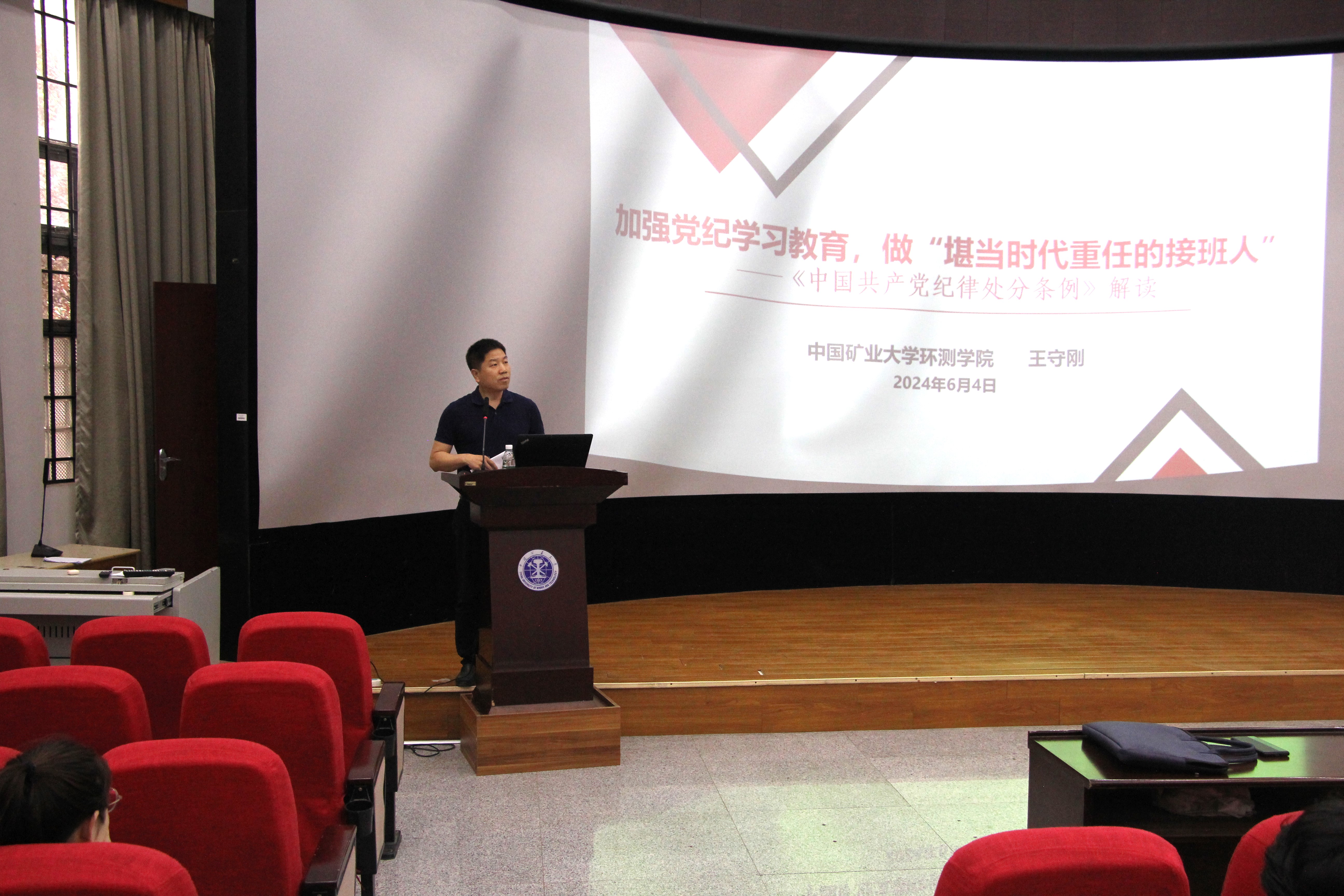 在环测楼B109开展以“加强党纪学习教育,做堪当时代重任的接班人”为主题的毕业生党课。党课由学院党委书记王守刚主讲,全体毕业生党员参加学习。