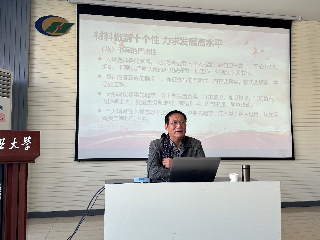 培训会上,邱慎耕老师以“按照十性要求做材料,力求党员发展高质量”为题进行了讲解。他强调,发展党员是保证党的事业接续发展的要求,党员质量是保持党的先进性和战斗力的保证,做好党员发展资料是保证发展质量的前提。邱老师从学生党员发展资料检查中发现的问题出发,提出了要保证“内容的完整性、内容的正确性、格式的规范性、时间的一致性、材料的真实性、程序的合规性、结论的明确性、书写的严肃性、把关的责任性、修改的合理性”十性要求,以提升基层党务工作的规范性、严肃性和真实性。