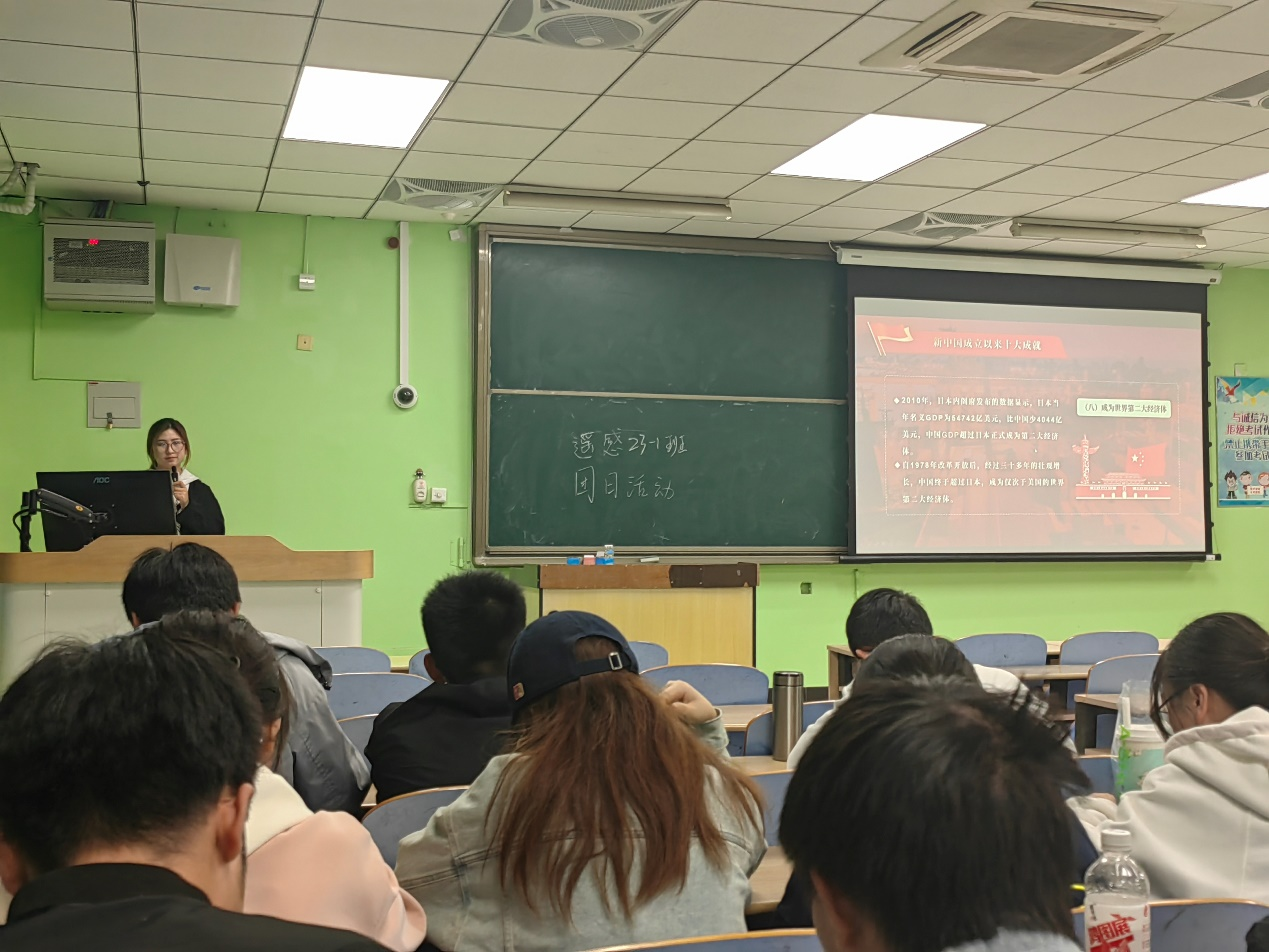 活动伊始,团支书杨苏为同学们列举了新中国成立以来的十大成就,不管是两弹一星,还是载人航天,同学们都深感认同。然后,团支书杨苏提出许多有关十大成就的问题,曹建鑫,梁凤珠等同学踊跃发言。之后,团支书杨苏用五个例子向同学们展示了新中国的光辉历程并从四个方面解释了伟大奇迹的内涵。接着杨苏同学从李大钊的照片引入新中国的历史启示。此外,同学们观看了不同的抗战视频,并猜出了它们的名字。最后,杨苏同学提出了一个列举红色歌曲和猜红色歌曲的活动。同学们积极参加,热闹非凡。