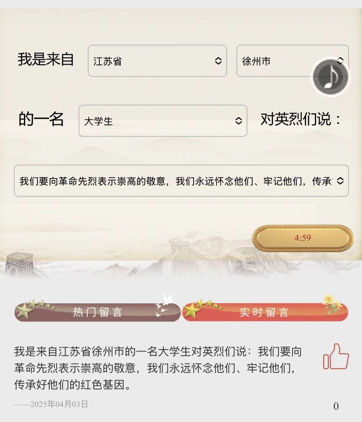 全体学生开展,学生登录“中华英烈网”,找到“赓续·2025·清明祭英烈”专题,通过多样祭奠形式,表达对英烈们的深切怀念与崇高敬意。