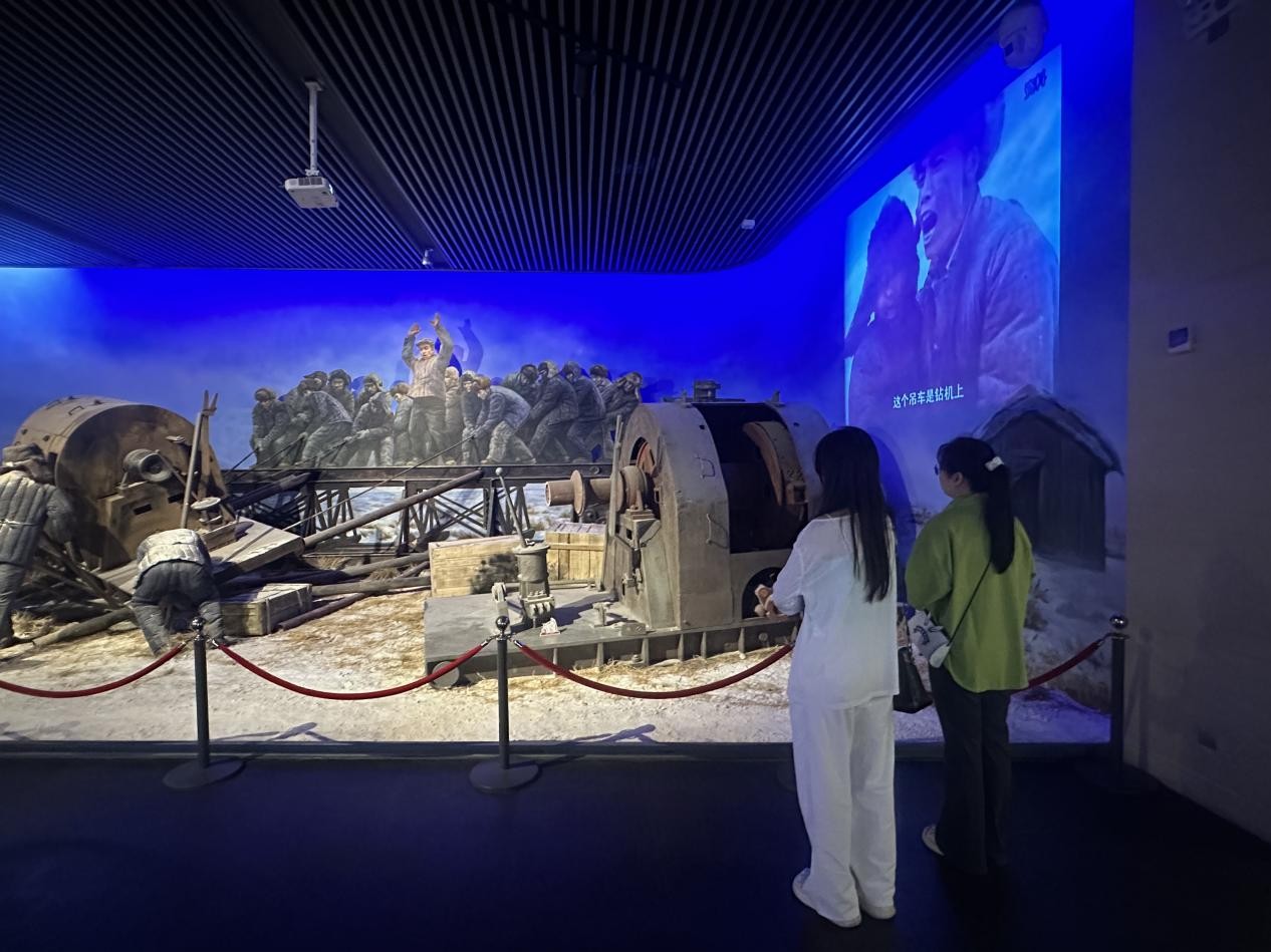 实践团聚焦铁人事迹、会战历史、精神内涵,详细记录了《不屈的童年》《赤诚报国》《艰苦创业》《科学求实》《无悔奉献》《鞠躬尽瘁》《精神永存》等七部分展览内容。馆内除了采用照片、文字、电动图表等传统展示手段外,还运用了硅胶像、雕塑、沙盘、场景复原、多媒体等现代展示手段,纪念馆内的大型群雕《石油魂》展现以铁人王进喜为代表的石油工人们气势昂扬、豪情满怀,以钢铁之躯为祖国献石油的英雄气概;馆内通过复原“端水打井”等场景,让实践团同学深刻体会到王进喜率领1205钻井队在极端寒冷的环境下坚持钻井的刻苦精神。实践团采集了大量影像素材,为后续的红色故事传播和理论宣讲筑牢根基。