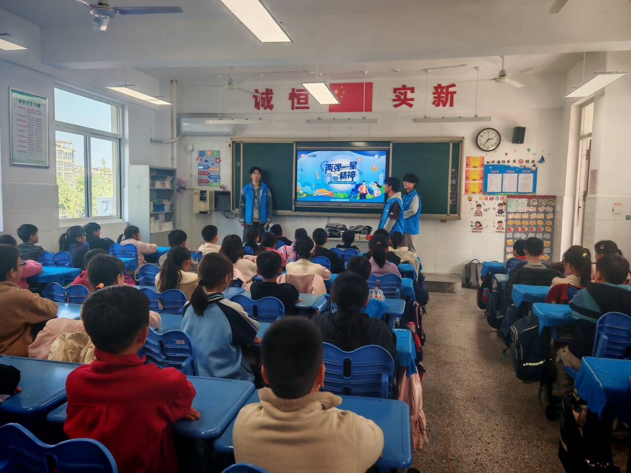 宣讲现场,志愿者们以 “什么是两弹一星” 为切入点,用生动形象的语言向同学们介绍原子弹、氢弹与人造卫星的基本常识,讲述 “东方红一号” 升空、第一颗原子弹爆炸等历史性瞬间。通过播放精简版科普视频,同学们直观感受了大国重器的震撼力量;在图片展示环节,志愿者详细讲解了 “两弹一星” 元勋们的英雄事迹,用钱学森、邓稼先等先辈 “隐姓埋名搞科研” 的故事,让孩子们体会到老一辈科研工作者的家国情怀与责任担当。
