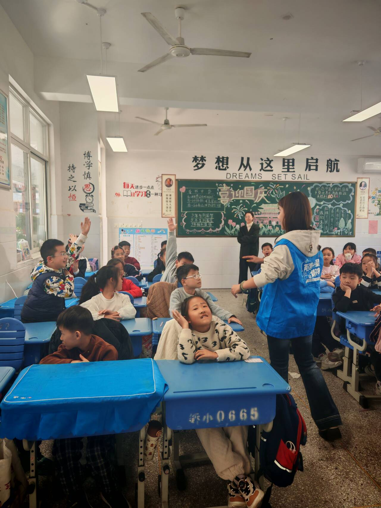 互动环节中,志愿者们提出 “‘东方红一号’发射于哪一年”“两弹一星精神包含哪些内容” 等趣味问题,同学们积极举手、踊跃作答,现场气氛热烈。针对孩子们提出的 “原子弹是怎么制造的”“卫星在太空能做什么” 等好奇提问,志愿者们用通俗的比喻耐心解答,引导孩子们主动思考、探索未知。活动最后,志愿者们鼓励同学们好好学习、奋发向上,将来为国家科技发展贡献力量,孩子们纷纷点头回应,眼中充满对科学的向往与对祖国的热爱。