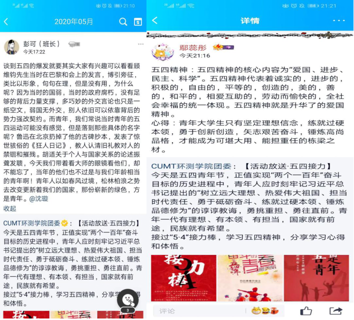 此次线上主题活动,增强了班级团支部的凝聚力,使同学们将五四精神铭记于心,并使我们深刻意识到将五四爱国精神彻底贯彻落实到现实的学习工作与生活中的意义。
