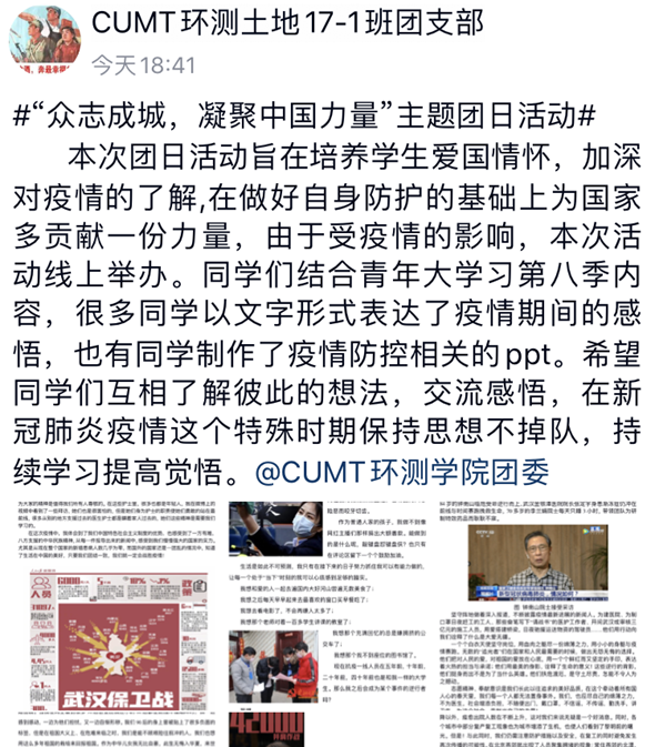 3月11日至12日,土地17-1班团支部在线上举办了“众志成城,凝聚中国力量”主题团日活动。本次活动旨在培养学生爱国情怀,加深对疫情的了解,在做好自身防护的基础上为国家多贡献一份力量。同学们积极响应,投稿了文章、幻灯片等多种形式的作品,表达自己的所感所想。
