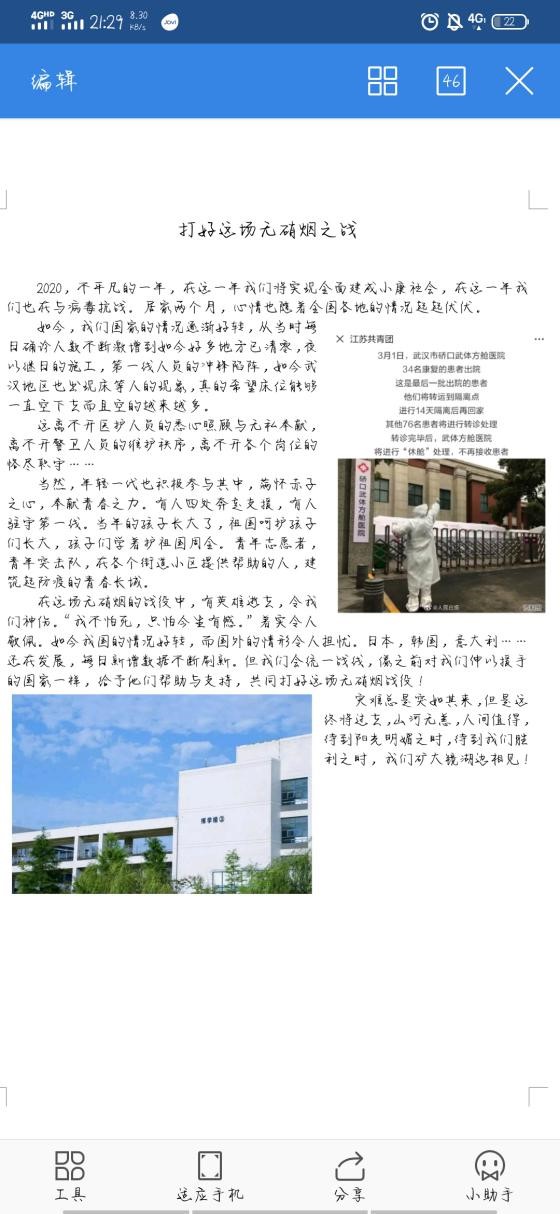 本次团日活动采取线上模式举行,同学们需通过手机、电脑等了解到最新的疫情消息,并以此为素材通过ppt、文章等形式表现相关主题。从同学们的作品中,表达出了对于大难当前,中国人民万众一心抗病毒行动的深切思考与感悟,体现了同学们虽困于家中,但心系国家、心系疫情,并传达了对奋斗在抗击疫情一线的勇士们的敬佩之情,用自己的一份绵薄之力为抗疫之战加油,充分的发扬了“众志成城,团结一心”的抗疫精神。