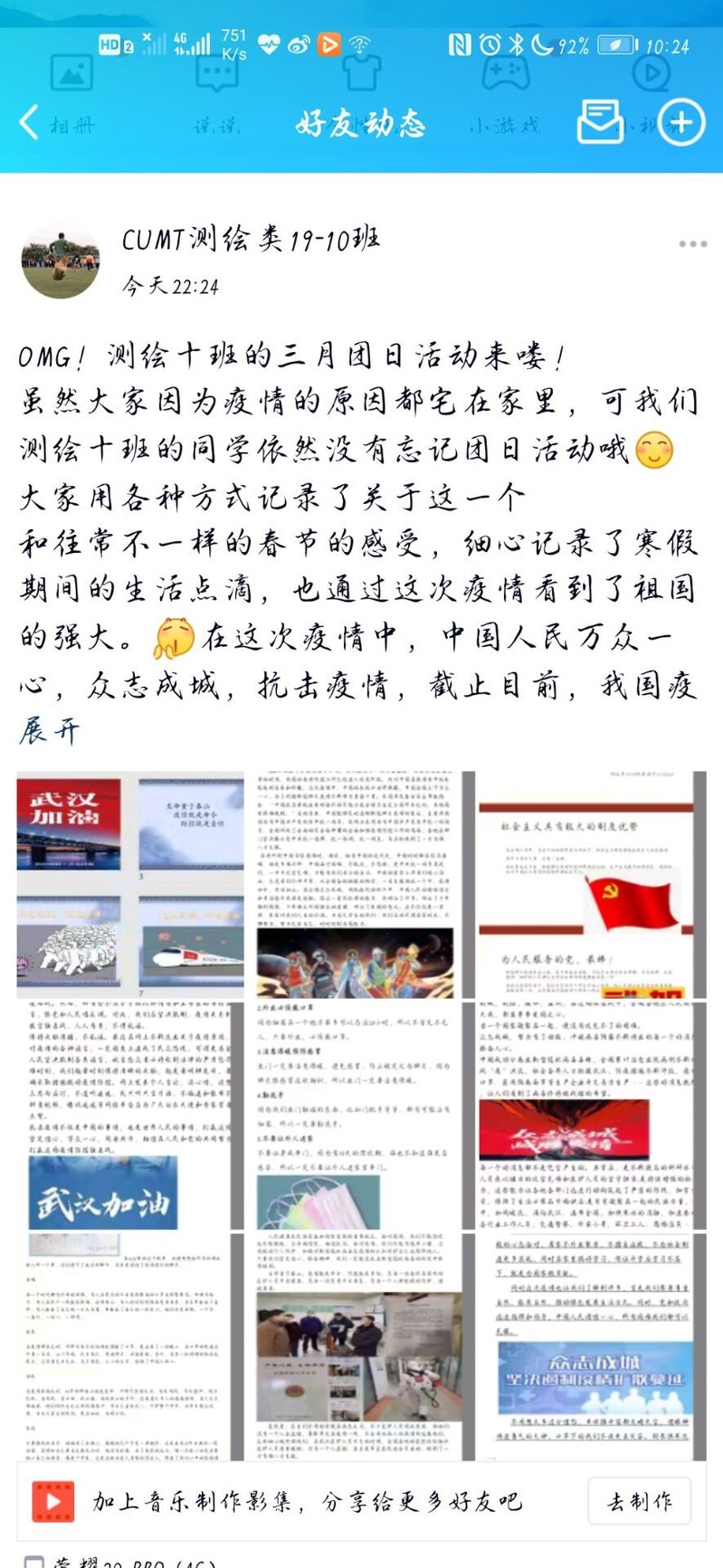 为了响应学院团委号召,3月1日至3月15日测绘类19级10班团支部开展“众志成城,凝聚中国力量”主题团日活动,本次活动采用线上的方式进行。