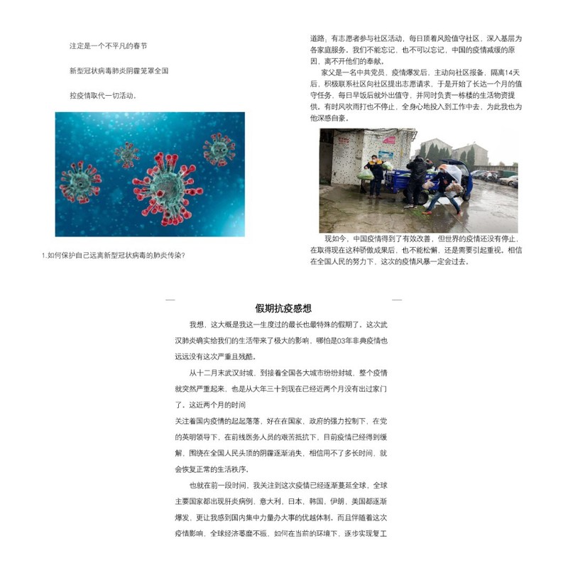 这是一个本该春暖花开的三月,控疫情却取代了一切室外活动。在举行线上团日活动期间,我们班有的同学收集了防控疫情的相关知识,从生活中的细节出发告诫我们如何保护自己远离病毒传染;有的同学关注着国内外疫情的起起落落,表达了这段时间以来自己的所观所感,抒发了自己对生于种花家的欣慰自豪之感;也有同学赞美了疫情中的逆行者,正是因为有他们的仁爱之心和忠诚担当,我们才有信心打赢这场疫情阻击战。其实,每当重大灾难发生时,我们的身前总有这样一群人挺身而出,无数的公安干警、医护人员、建筑工人,以及全国各地的社区工作人员和青年志愿者都在尽自己的一份力量,为我们筑起一道道铜墙铁壁。