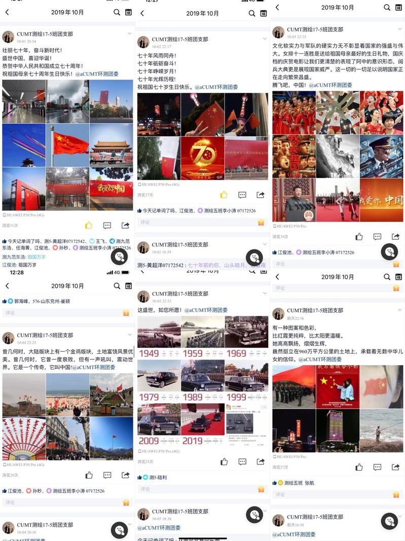 本次活动通过团支部领导本班同学在国庆假期期间线上动态发布的形式来开展,团支书与宣传委员不仅每天在班级公众号上发表为祖国庆生的动态,而且还认真阅读每一位同学的动态,筛选出优秀的动态作品,用班级公众号进行转发推广。班级同学都积极参与这次活动,用他们对祖国的热爱写出了许多爱国情诗,虽然大家的表现方式不一,但无论是在外游玩的还是回家的同学,都通过拍摄各地庆祝国庆的情景,展现举国共庆祖国七十华诞的盛世景象,还有不少同学晒出与国旗的合影,以此来表达对祖国的热爱。