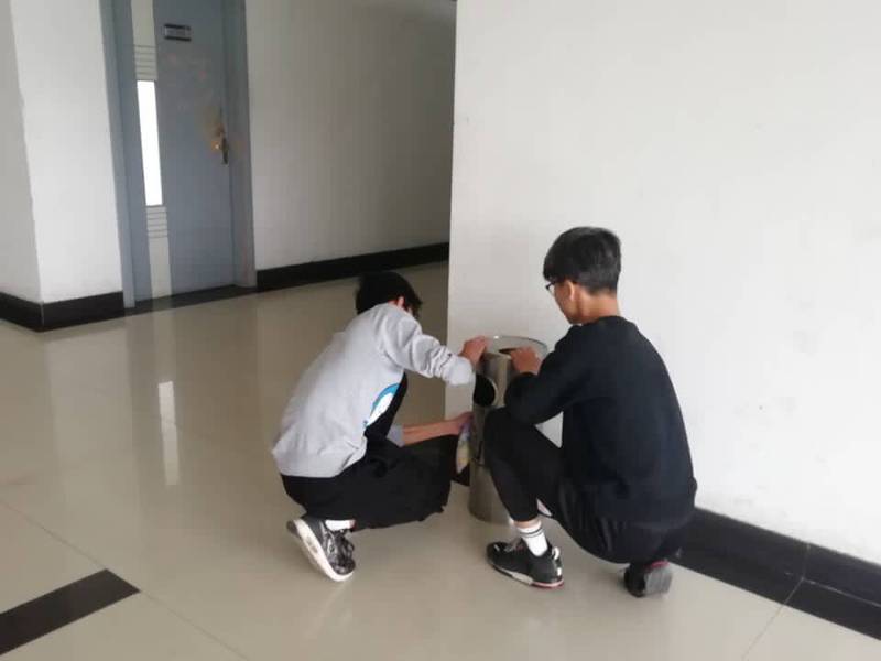 上午8点半,参与活动的26位志愿者通过自带的清洁工具,两人一组在博学楼的各层进行清扫,志愿者们有条不紊地清洁A、B、C区垃圾桶表面,并对垃圾桶的“接水盆”进行换水,同时也打扫了垃圾桶外面的垃圾。在经过一个多小时的努力,志愿者们圆满完成了清洁工作,并得到了楼内学习的同学的夸赞。