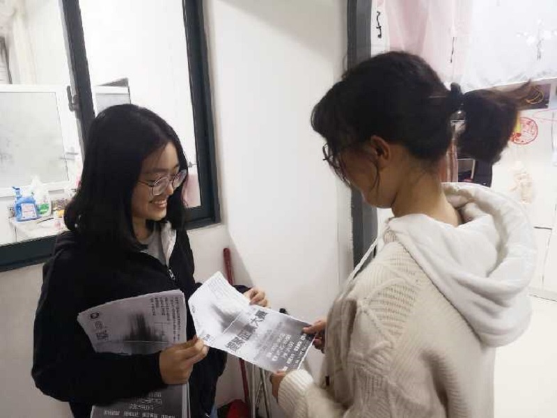 提案委员会成员于桃五楼下集合,并由相关负责人对本次活动主要内容及注意事项进行简单讲解,随后,各成员进入宿舍楼对同学们进行宣传。宣传人员首先就大赛的内容和背景对同学们做了简单的介绍。在同学们对大赛有一定了解后,宣传人员再进一步对活动的主题及参赛要求进行详细讲解。宣传人员诙谐的话语,清晰的讲解,充分调动了同学们参与大赛的热情。此后,宣传人员对有兴趣的同学进行了意向登记及宣传单的发放。