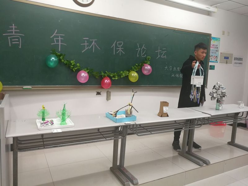 此次活动以小组形式开展,分“待子琢璞玉”和“环保议题讨论”两个环节。活动进行中,主持人介绍了参会评委,对活动流程,各环节规则和注意事项做了说明。“待子琢璞玉”环节需要各小组以废旧物品为材料,通过创新性设计制作具有观赏价值且和环保价值的作品,设计过程中小组成员们配合默契,灵活运用纸杯,墙纸等废旧物品,以最高效率完成作品,现场气氛十分活跃。环保议题讨论环节要求各组选手就抽到的环保议题展开讨论,并派出代表上台答辩,辩手们就各自议题结合图纸阐述了小组构想,评委对小组提案提出了指导性、实践性意见。活动最后,评委将两次打分取平均值作为此次活动的最终得分,结果会以通知形式予以公布。