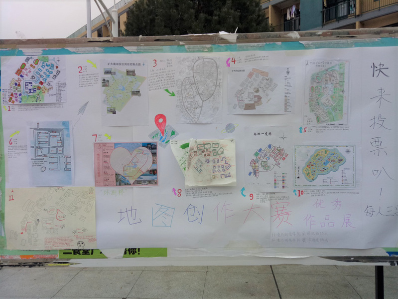 中午12点,活动正式开始。各小组的作品于二食堂广场进行展览,活动现场吸引了众多同学驻足观赏,同学们纷纷就作品的各方面性质展开评论,并为自己喜欢的作品进行投票。本次“地图创作大赛”于11月20日开展,经过10天左右的制图过程,各个参赛小组均发挥了自我的个性与创意,制作出了一幅幅独特的矿大专题地图。他们的作品样式各异,从不同方面对校园进行了描绘。其中的矿大分层导航图、测绘控制点地图、矿大网红景点图等专题地图更是美观性与实用性兼备,极具吸引力。