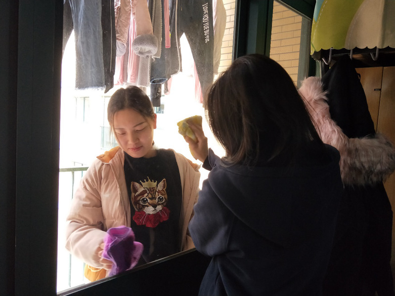 生活权益部干事在桃五、松二楼下集合,并分配好各自负责宿舍,大扫除正式开始。干事到各自负责宿舍进行通知并监督卫生打扫,同学们早早地准备好了抹布、铲子、清洁球等扫除工具,宿舍长同学对打扫任务进行了详细布置,强调扫除的重点与难点,并督促同学们仔细打扫宿舍卫生。任务明确后,大家各有分工,紧张忙碌地投入到扫除工作中。