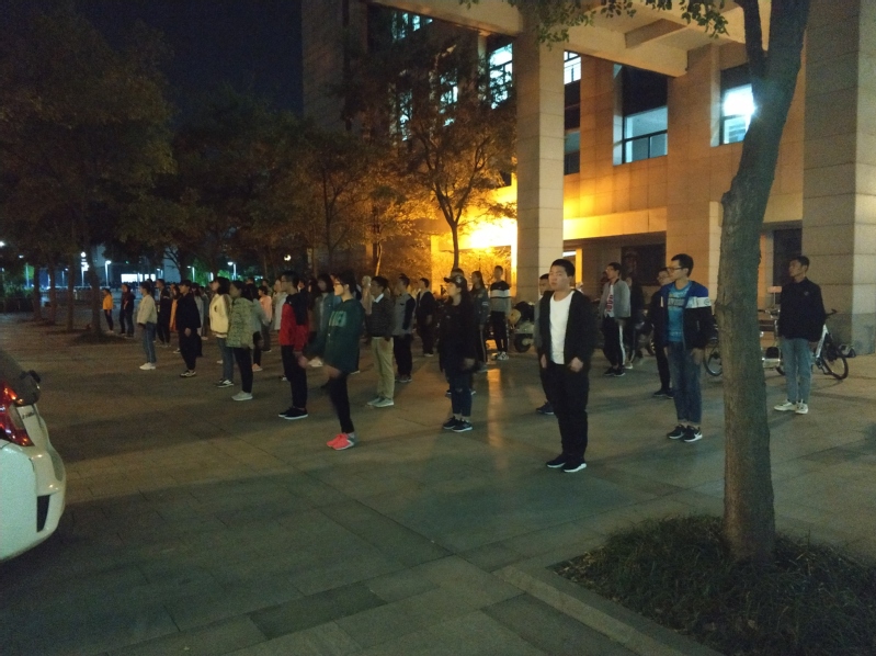 广播体操队全体成员在图书馆一旁空地上进行训练,此次训练旨在为即将到来的中国矿业大学体育大会做准备。