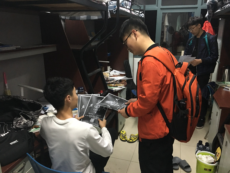 学生会工作人员于四月十日晚上九时,前往桃苑五号楼,开展扫楼宣传活动。