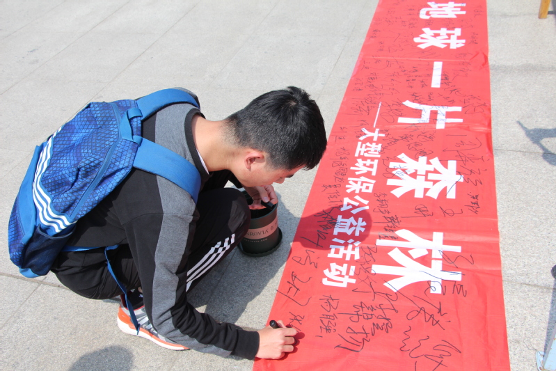 中午12:00,志愿者们将提前准备的印有“换手中一双筷子,还地球一片森林”的条幅粘贴于帐篷前,随后向来往的同学发放传单并介绍少用一次性筷子对我们生活以及地球森林的重要意义,同时邀请同学们在条幅上签名,最后给签名的同学们赠送一双可循环使用的木筷子留作纪念。来往的同学都十分积极地参与签名活动,耐心听取志愿者们的讲解,现场气氛活跃。