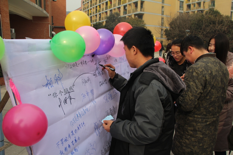 11点30分,青年志愿者协会的干事们到达场地,准备好活动的物品等待同学们的到来。12点整,同学们到达相应场地报名,各位干事们开始向他们介绍活动的情况,并对后续相关比赛进行宣传。在青春广场,参加活动的同学们在报名之后获得一次踩气球的机会,气球内分别装有红色和黑色的纸条。踩到黑色纸条的同学需要再横幅上写下抵制语言暴力的宣言,踩到红色纸条的同学则需在横幅上签下自己的名字。之后,报名参加比赛的同学将在一张卡片正面填写表达抵制语言暴力话语,并在背面征集同学签名,以此来得到其他人的支持,扩散比赛影响力。同学们表示通过这样形式的活动,自己认识到了语言暴力的危害,以后生活中会尽力抵制语言暴力,让校园更加和谐。