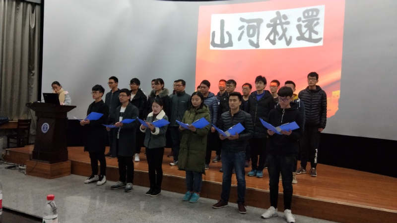 为响应学院号召,纪念“一二九”运动爆发82周年,使当代大学生牢记历史,不辱使命,并激发其爱国热情,测绘16-1班于12月9日晚在环测楼B109积极参与环测学院举办的“12.9”爱国纪念班级风采展示决赛,决赛现场由蒋怡然同学主讲班级风采展示PPT,班长张玉环、团支书杜奥迪等六名同学带领全班朗诵爱国诗词《还我河山》。