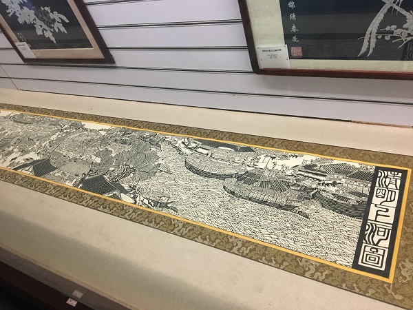 同学们对扬州剪纸产生了浓厚的兴趣,想对其细细研究一番。首先同学们乘电梯到达三楼看到了剪纸展览,这些作品各式各样且大多来自民间。题材内容也涉及广泛,有民俗风光,如祝寿,有花鸟鱼虫,如四季图、菊花图,也有雄劲英姿,如八骏图……,更令人叹服的是,这些剪纸作品不单单是剪纸,更是将绘画糅合地巧夺天工。欣赏扬州剪纸,简直就是一幅幅精彩的画卷。扬州剪纸的细腻与精巧着实自成一家。