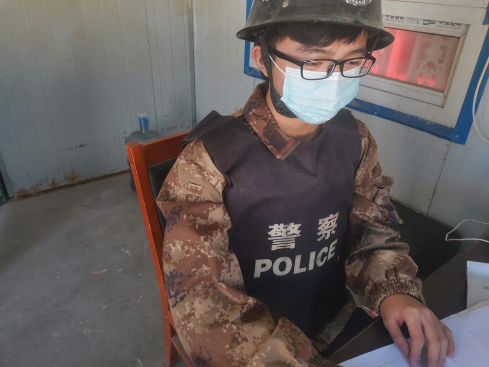 学子员胡明明在五连机关门口进行值班工作,对来访人员登记个人相关信息并进行体温测量,对体温异常人员不允进入机关,在夜间11点钟时,相关人员对值班的工作人员进行点名,汇报当天工作是否正常。在值班过程中,由于来访人员较多,要对每个人进行登记和测温,不能有丝毫马虎,严谨按照标准来执行。胡明明也深刻感受到了防疫工作人员的辛苦。