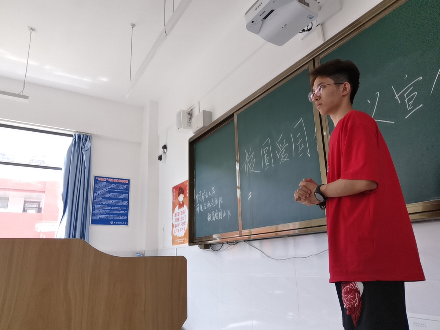 上午10时,实践团到达学生教室,开始准备活动内容并等待学生到达教室。随后,团队成员开始爱国主义宣传活动,组织在校学生在教室里观看有关疫情的爱国主义宣传视频,并在结束观影后,让所有学生就疫情期间出现过的爱国模范来写下自己的感悟。最后,团队成员向学生分享了抗疫一线的感人事迹,并对爱国主义所属含义进行了解释。实践团向学生们讲到,学生作为国家的新鲜血液,站在了这个时代传承奋斗精神与爱国情怀的第一位,所以每一个人都应该努力学习,让爱国情怀根植与心中。
