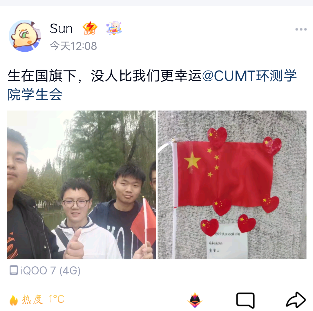 学生会生活权益部开展了“国旗和你,相约矿大”活动。此次活动采取线下校园打卡的形式开展,面向2021级新生,以让新生在校园内寻找国旗并进行合影的趣味方式,使其进一步了解校园,增强对祖国的热爱之情。