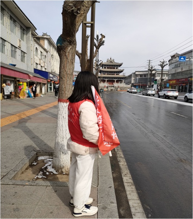 学子王占芳于1月18日至24日在家乡青海省海东市互助土族自治县的街道参加了交通文明劝导志愿活动。