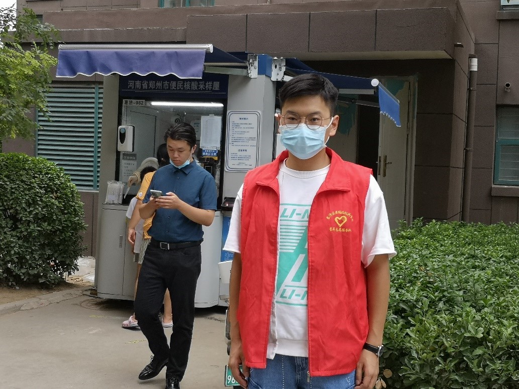 学子张正阳在河南省郑州市惠济区郡城雅舍社区参加郑州市惠济区长兴路街道老鸦陈村志愿服务站所举办的相关志愿活动。在郑州市常态化核酸检测中担任志愿者,协助维护现场秩序。