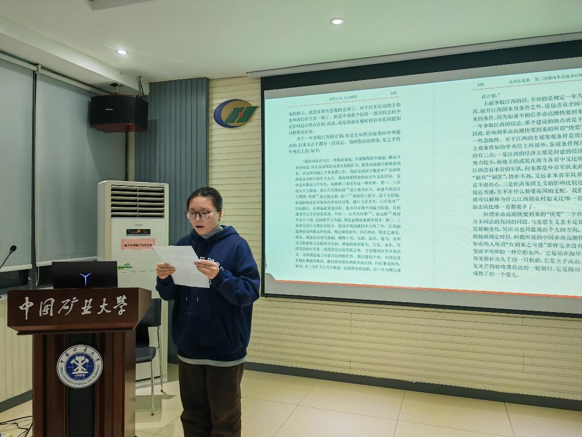 活动伊始,刘秉锋同志通过PPT形式带领同学们回顾中国共产党成立之初遇到的种种困难和历史上的重大战役。陈毅曾说“淮海战役的胜利,是人民群众用小推车推出来的”,这才是真正的民主。活动过程中,孙洁雅同学激情澎湃地朗诵了《星星之火,可以燎原》节选,让同学们感受到先辈们看到中国革命高潮即将来临并必将取得胜利的喜悦。