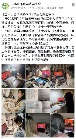本次培训会以线上方式开展,通过线上观看党的第二十次全国人民代表大会全程,体会党的二十大报告中的精神内涵,培训会中,同学们认真聆听了习近平总书记在大会上作的报告,及时记录重要语句,会议结束后,同学们深受鼓舞,受益匪浅,写下自己的心得感悟,纷纷表示要以党的二十大精神为指引,将党的二十大精神落实到学习和生活中,不断规范自己的行为,端正思想态度,找准政治定位,肩负起新时代中国青年身上的民族复兴重任。本次活动圆满结束。