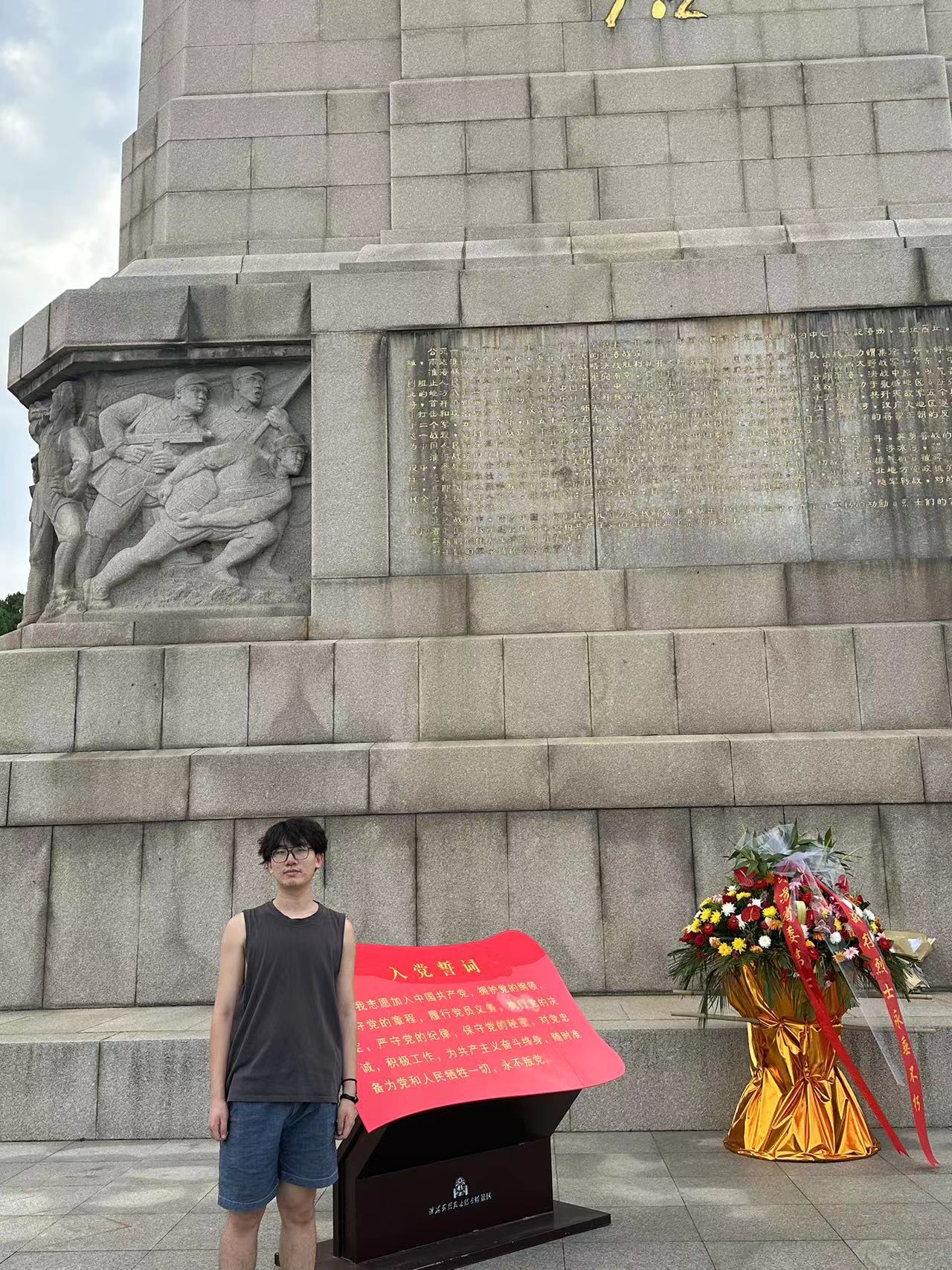 淮海战役是解放战争时期中国人民解放军中原野战军、中国人民解放军华东野战军在以徐州为中心,东起海州(连云港),西至商丘,北起临城(今枣庄市薛城),南达淮河的广大地区,对国民党军队进行的战略性进攻战役。是三大战役中的第二个战役,也是解放军牺牲最重,歼敌数量最多,政治影响最大、战争样式最复杂的战役。这次战役从根本上动摇了国民党政府的统治,成为决定中国命运的大决战。经充分准备后,该同学积极前往淮海战役烈士纪念塔。