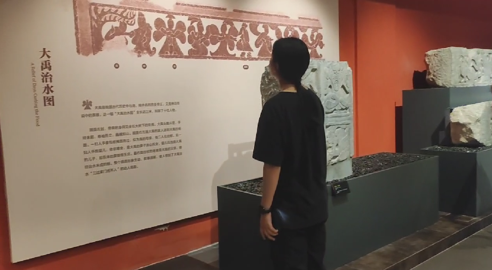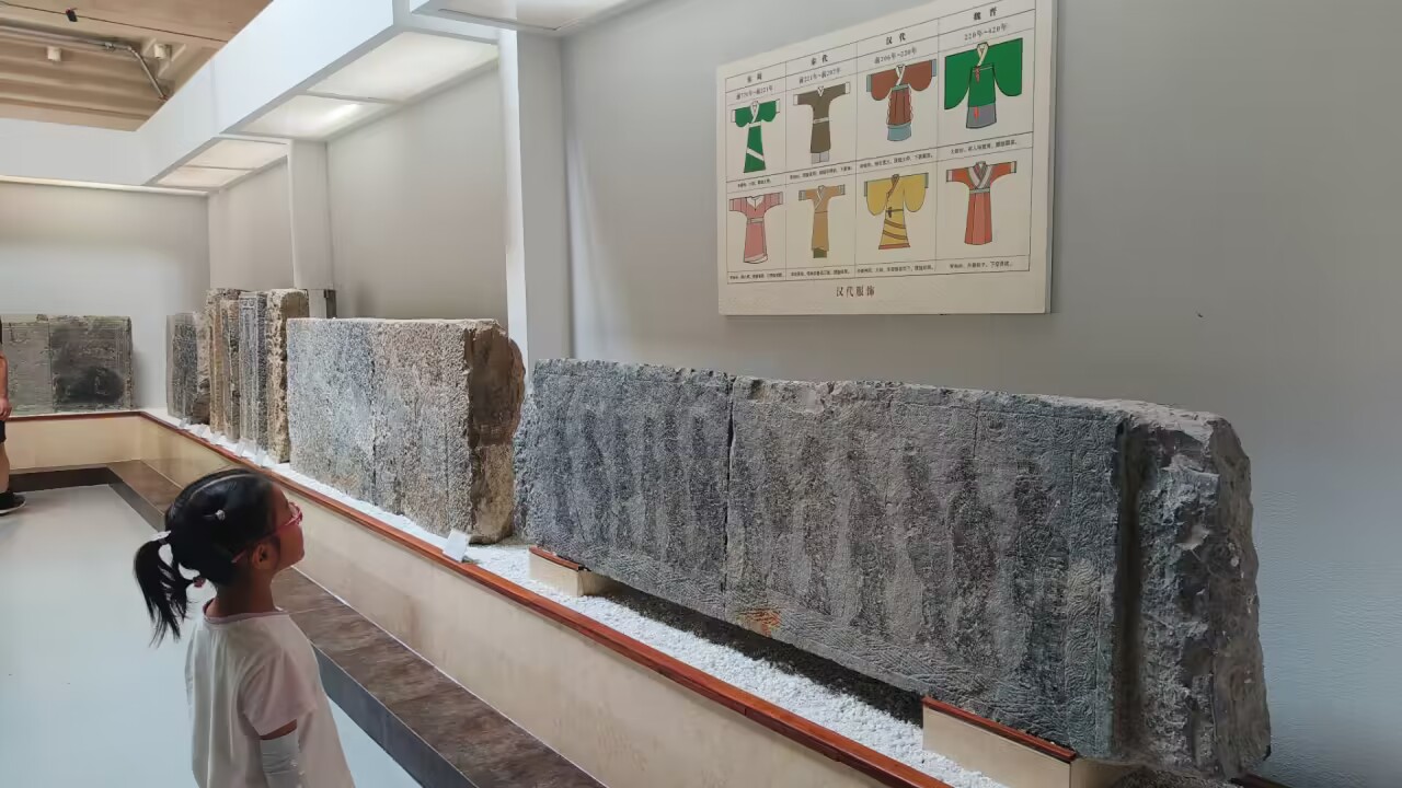 在导游的带领下,团队成员们共参观了南北两个展馆。展厅集中展示了“神道天路图”、“缉盗荣归图”等极富生活气息的画像石,漫步画像石间,犹如置身瑰丽的历史画廊,汉代工匠们以石为纸,留下的千年前的生活印记和浪漫想象,给团队成员许多有益的启示。在欣赏画像石作品的同时,团队成员了解了古代神话传说、历史故事以及政治、经济、文化等方面的知识,深刻感受到了历史文化的厚重。