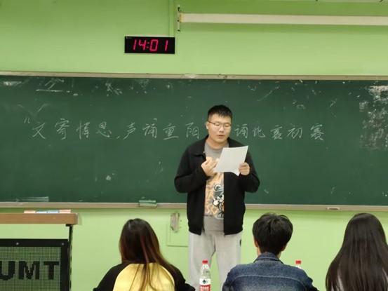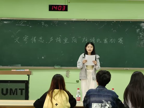 本次活动于10月25日在博四c207教室举办。选手们需自选一篇或一部分与重阳节密切相关的文章并依次按照编号上台朗诵两分钟。在活动期间,选手们声情并茂的朗诵赢得了场下如火焰一般热烈的掌声。最后,由在场的三位评委根据每位选手的的相关表现评出选手得分。