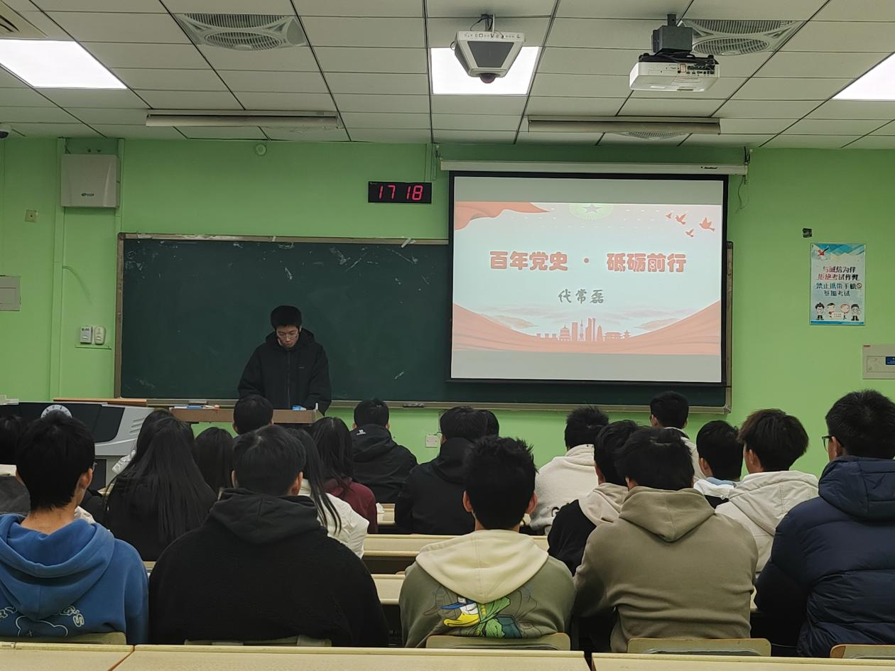 本次活动以号召同学们从党史中汲取力量、不忘初心、砥砺奋斗,更好的传承和发扬党的伟大精神为目的。活动分为四个环节,第一环节由代常磊同学进行“百年党史·砥砺前行”主题演讲,代常磊同学演讲铿锵有力,慷慨激昂,引发了同学们对党史的感触,调动了同学们对党的崇敬和自豪。第二环节,团支书组织同学们进行“历史事件猜猜猜”游戏,同学们抽取一些描绘了党史中的重要时刻的图片,由同学们说出其对应事件和意义,在这个活动中加深了同学们对党史的深刻了解,游戏结束后团支书播放记述了党史中重要时刻的视频,增进同学们对党史的理解,唤起了同学们对党的自豪感。第三环节为接力朗诵,由李斯嘉同学领诵,每位同学各朗诵一句抒发爱党、为党自豪的诗句,并以视频形式记录。最后一个环节,同学们共同歌唱《我们走在大路上》,在悠悠歌声中抒发对党史的了解、热爱、骄傲,也在这歌声中结束了本次团日活动。