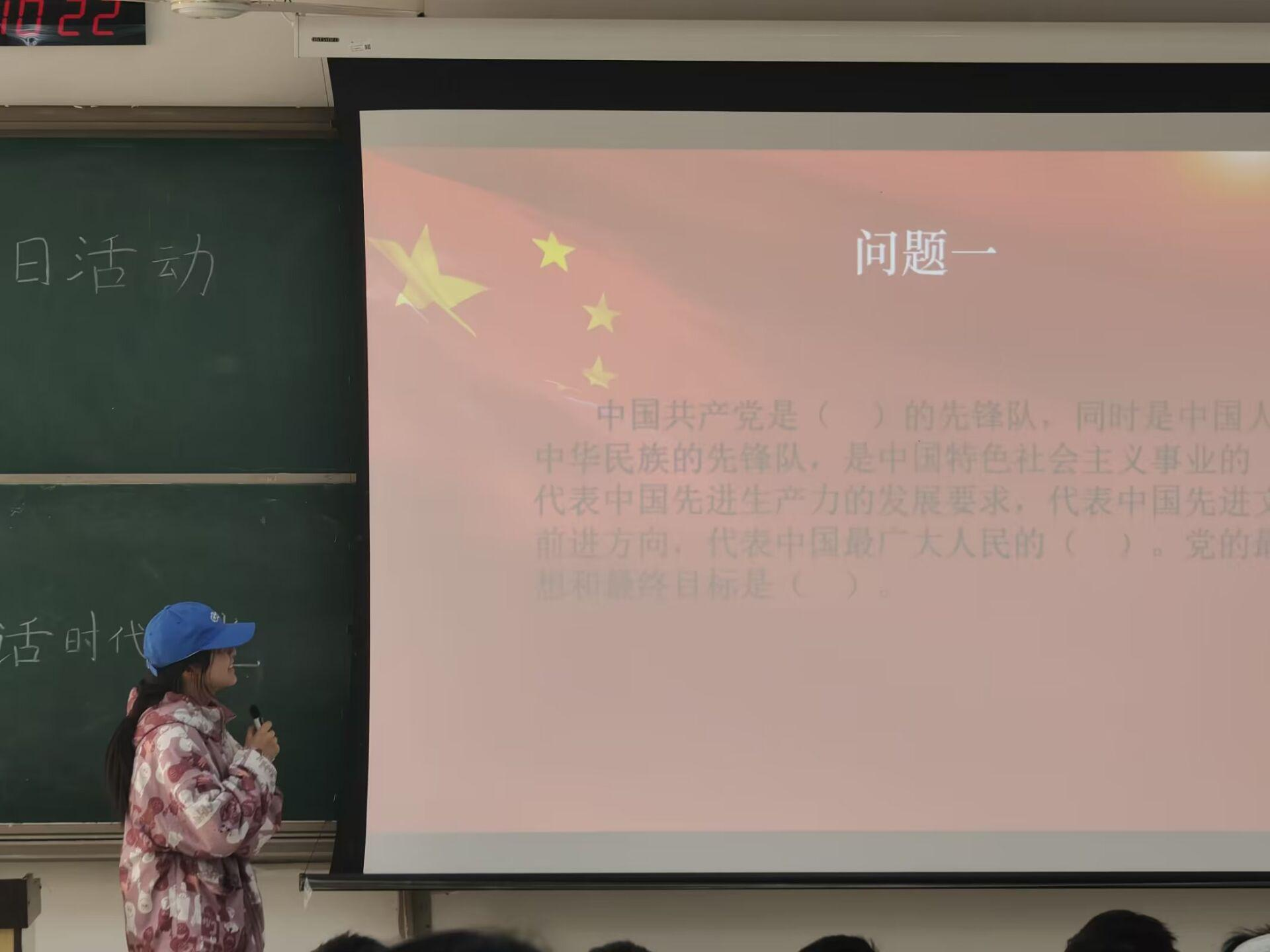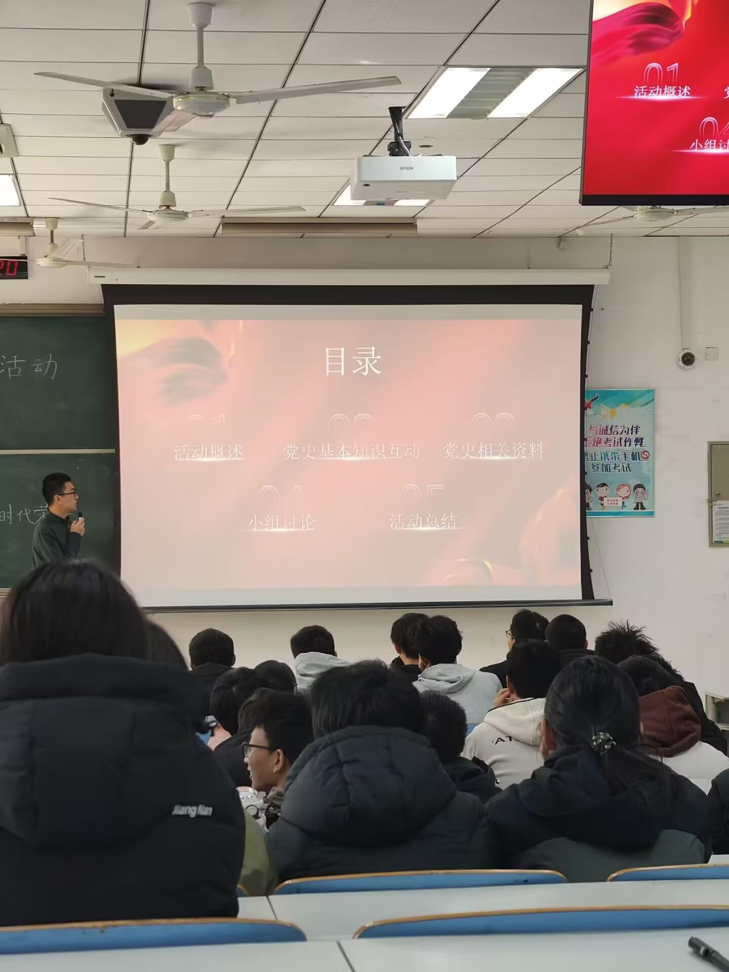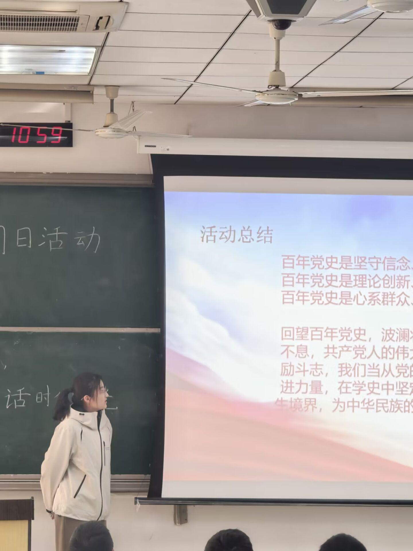 活动伊始,王子赫同学对本次团日活动进行活动概述,向我们介绍习近平总书记高度重视学党史、用党史,多次强调“历史是最好的教科书,也是最好的清醒剂”同时,他希望同学们一心一意跟党走,不忘初心,牢记使命。随后,唐瑞婕同学进行党史基本知识互动,她随机挑选了数位同学回答党史基本知识,被挑选的同学都正确回答了相关问题,此活动意提高同学们对党史的关注,希望同学们时刻不忘党史,坚定理想信念。接着,王子赫又向我们介绍了党史相关资料,通过观看党的光辉历程视频,同学们对党史有了一个更为深刻的理解。在此之后进入小组讨论与同学展示环节,各班派出一位同学上台对大家分享了自己对党史的理解,本环节强调了党对人民作出的卓越贡献和辉煌成绩。最后,由张译文同学进行活动总结,她提出百年党史是坚守信念,牢记初心的历史,希望我们能够从党的奋斗历史中汲取前进力量,在学史中坚定人生志向、升华人生境界,为中华民族伟大复兴注入力量。