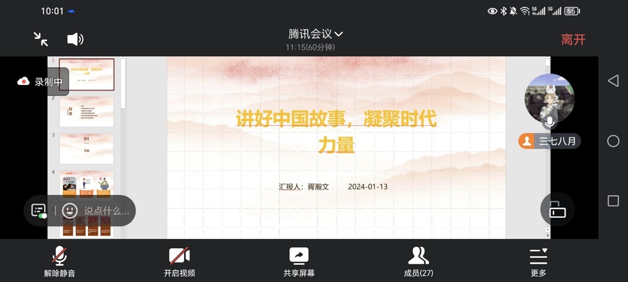 中国文化的国际传播已经成为文化软实力建设的重要内容,而讲故事是国际文化传播的最佳方式。为了加强中华优秀传统文化教育,弘扬中华优秀传统文化,遥感科学与技术22-2班团支部于2024年1月13日在腾讯会议举行了以“讲好中国故事,凝聚时代力量”为主题的团日活动。本次活动由团支书胥瀚文主持。