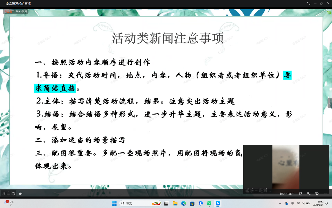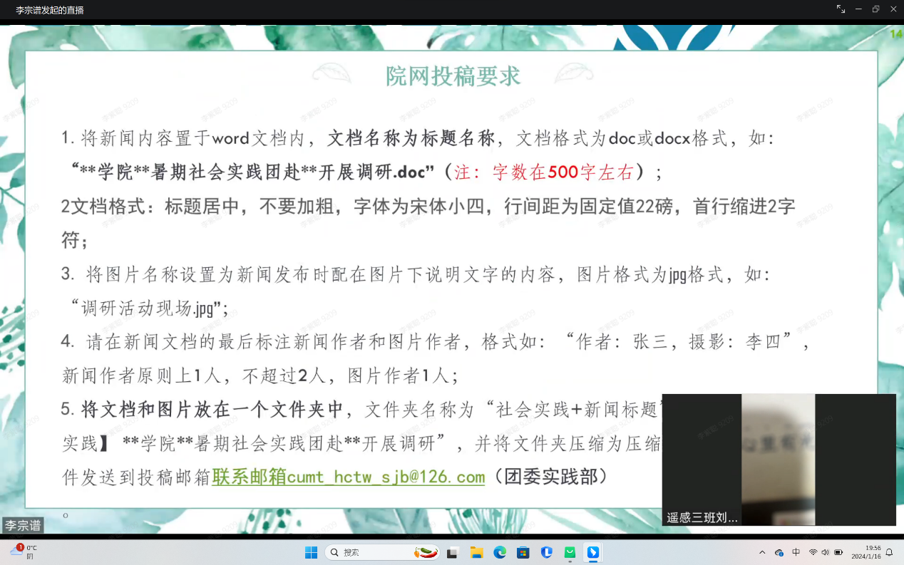 为了督促大学生学习和实践相结合,落实到位,落实彻底所做出的诸多努力。针对所需要提交的材料——新闻稿的部分,会上专门邀请了新传采编部的部长刘慧申同学进行指导,旨在帮助同学们更好的完成本次社会实践。在答疑部分,也回答了同学们关于本次社会实践的一些具体问题,例如在哪里提交材料、所提交材料的具体要求、以及和外院同学组建团队需要注意哪些问题等等。最后讲解人李宗谱还邀请同学们弹幕发送自己还有疑问的地方,并对这些问题逐一进行了解答。