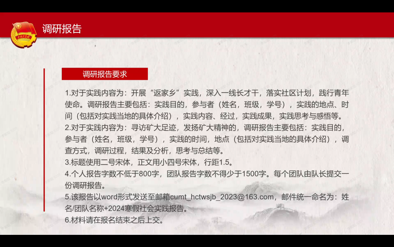 全体学生特别是2023级新同学颇有帮助。实践的内容主要分为三个方面:第一方面是开展返家乡实践,深入一线长才干;第二方面是落实社区计划,践行青年使命;第三部分是寻访矿大足迹,发扬矿大精神。和以往的社会实践有所不同的是,本学期的社会实践更注重实践和调研相关部分,要求同学们上传真实且有效的资料,并且直接上交到院内审核。我们也可以通过此举看出明升体育