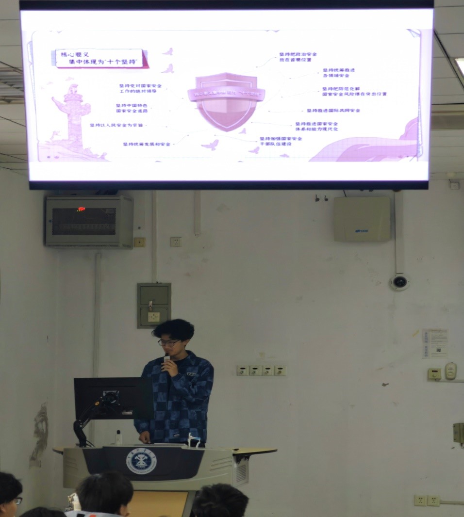 之后便是同学们的讨论与汇报环节。遥感二班高瀚宇、遥感二班王钤和遥感三班叶宗源三位同学分别从国家安全的含义、危害、事例等角度阐明国家安全与同学们息息相关的道理。活动的最后,由遥感一班团支书张译文进行总结,倡议同学们从身边细节做起,维护国家安全。