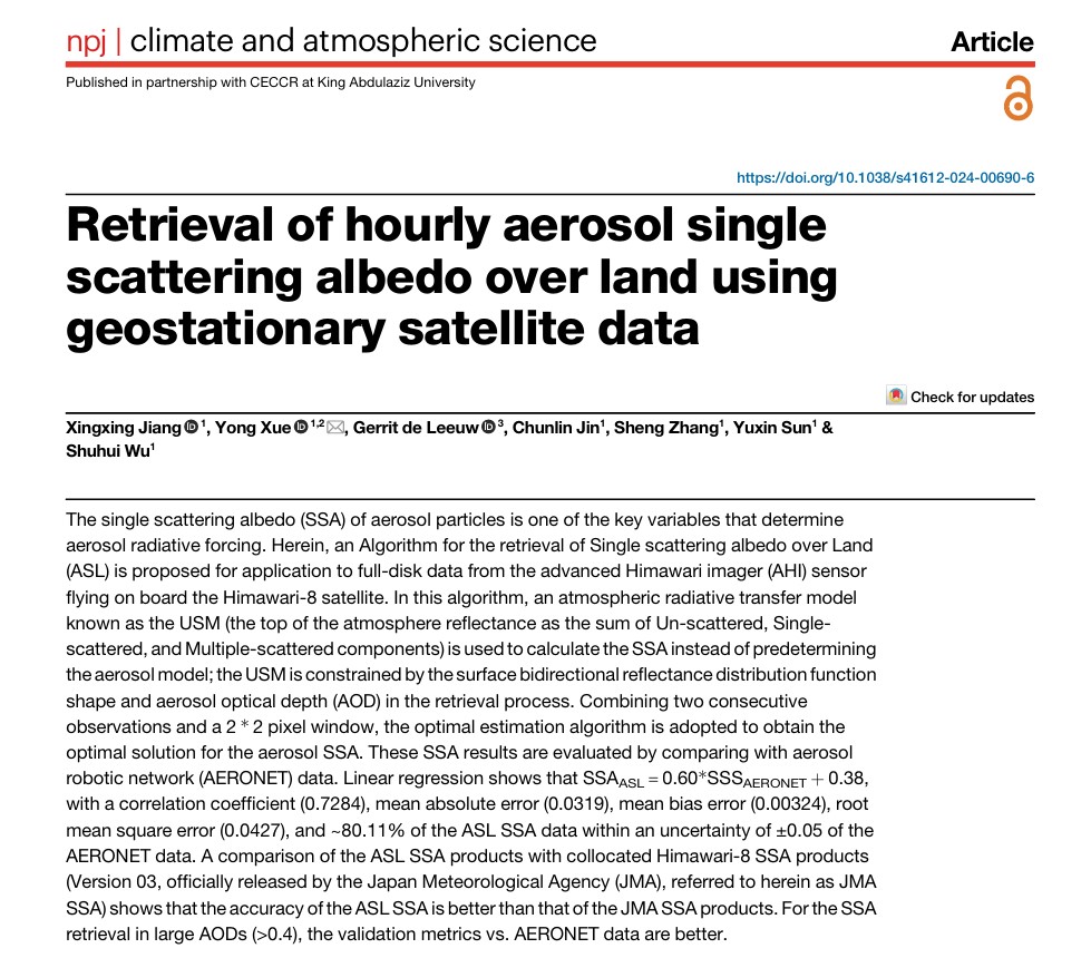 该研究的相关成果以“Retrieval of hourly aerosol single scattering albedo over land using geostationary satellite data”为题发表在地球科学领域国际权威期刊《npj Climate and Atmospheric Science》(JCR一区,中科院一区,IF=8.5),该期刊影响因子是在气象与大气科学领域国际排名第五位(JIF: 5/110)的期刊,属于《Nature》旗下,年发文量100篇左右。IERSD团队博士研究生蒋兴兴为论文的第一作者,国际欧亚科学院院士,国际宇航科学院院士薛勇教授为论文通讯作者,中国矿业大学为论文第一完成单位。