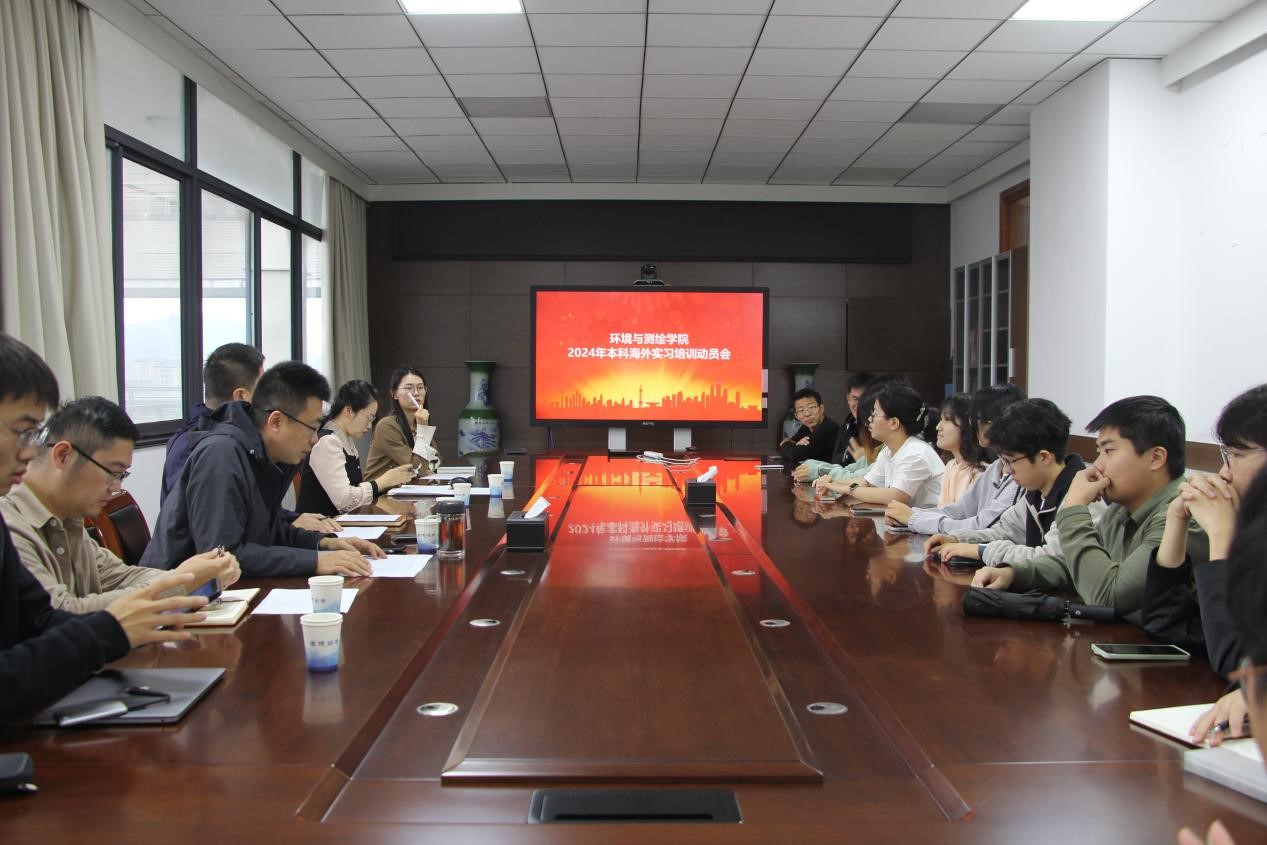 于环测楼A506召开2024年本科海外实习培训动员会。院党委书记王守刚,校国际合作交流处涉外管理办公室科长张馨元,辅导员李艳萍以及带队老师时洪涛、钱允致出席活动,动员会由院党委副书记韩福顺主持。