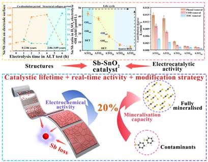 Sb-SnO2作为一种高效、低成本的电催化剂,使用寿命短而难于实现工程应用。针对电极材料改性导致电催化活性效果不佳、电催化剂界面结构与活性协同演变规律不明等问题,该研究深入解析Sb-SnO2在整个生命周期内的界面结构与电催化活性变化规律,明确指出锑氧化物流失是催化剂结构与活性变迁的关键因子。锑氧化物在结构上通过优先溶解的方式充当“牺牲剂”来保护主体SnO2,有效延缓结构崩塌;通过Sb5+/Sb3+电子对促进电子转移循环,有效增强了SnO2催生羟基自由基能力。提出以构建电化学活性系数与有机污染物矿化效率之间共阈值的方式来有效评估Sb-SnO2的电催化寿命和实时活性,规避了界面演化过程中带来的重金属析出和污染物中间产物毒性积累问题,从而实现其在废水处理过程中经济、高效运行的精确把控。此外,该研究也为电催化材料在整个界面演化过程中的活性衰减规律的表征提供了研究路径与策略。