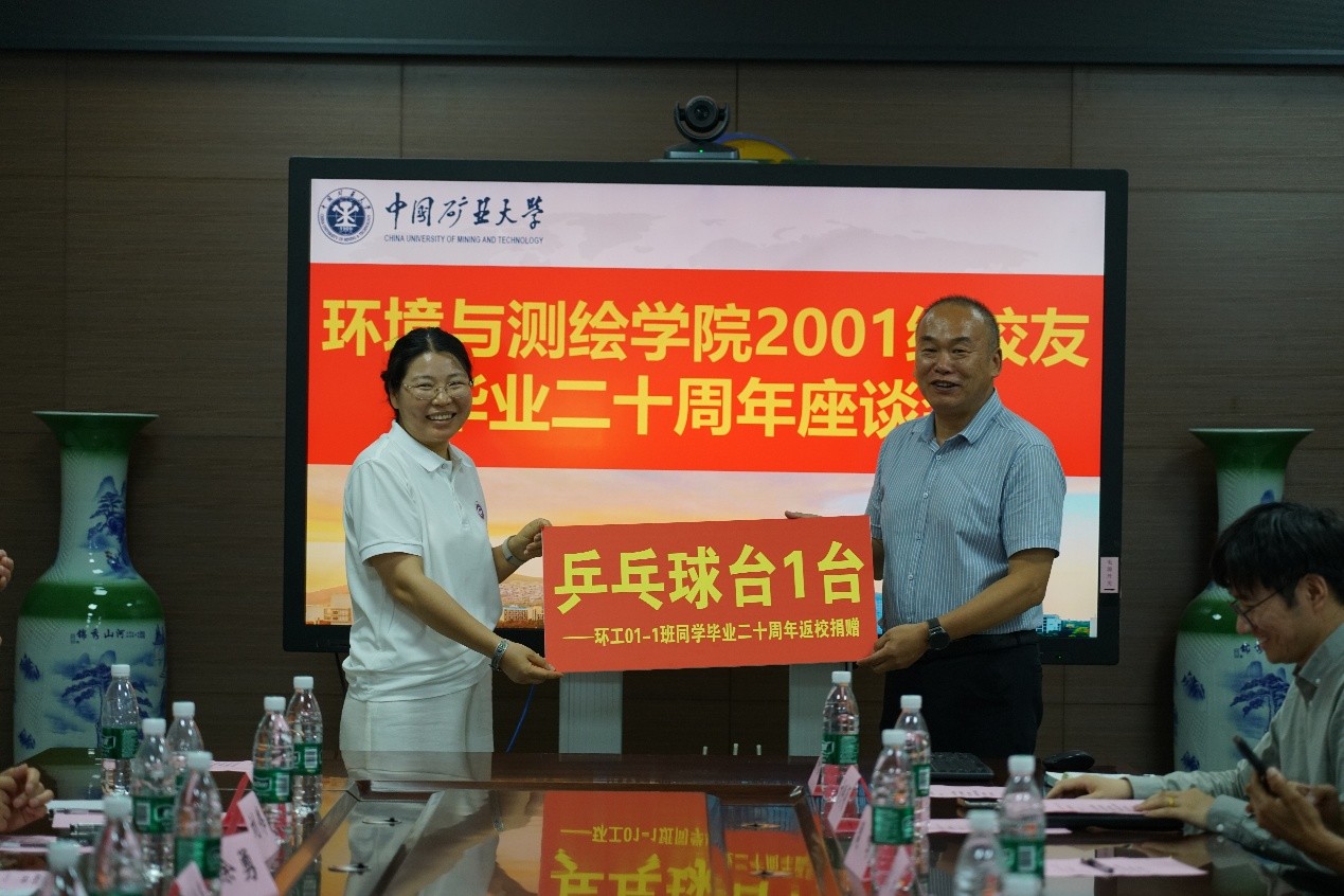 2001级校友向教师代表献上花束,并向学院捐赠了专业级乒乓球桌。校友们表示:“希望学弟学妹在科研之余能够强健体魄,将环测人团结拼搏的精神运用到生活的各个方面。”