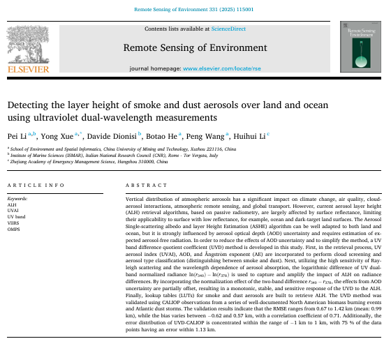 教师薛勇团队在《Remote Sensing of Environment》期刊(JCR一区,中科院一区Top)上发表关于气溶胶层高反演方法的研究论文,题为“Detecting the layer height of smoke and dust aerosols over land and ocean using ultraviolet dual-wavelength measurements”。明升体育