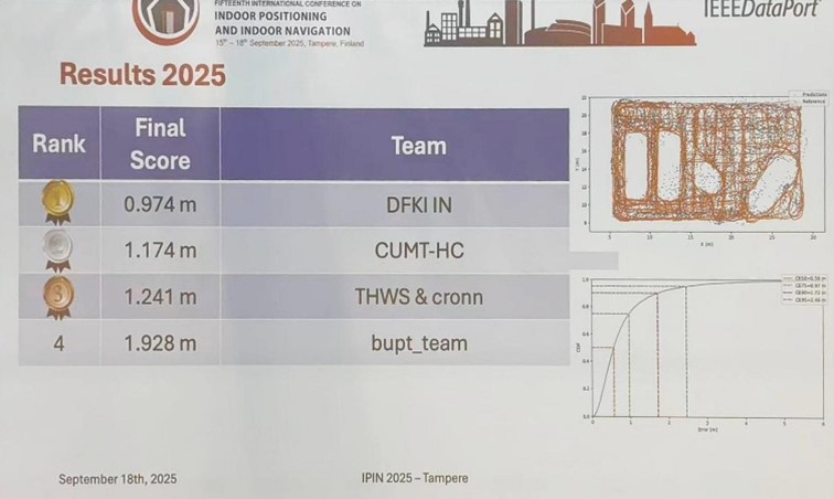 室内导航定位团队陈国良教授、孙猛副教授联合指导的“CUMT-HC”团队(成员包括博士生王腾、硕士研究生孙金超、刘杰、王耀辉)夺得了Track7:5G CIR + IMU赛道亚军,这也是我校测绘学科在IPIN室内定位领域顶级竞赛首次参赛并获奖。