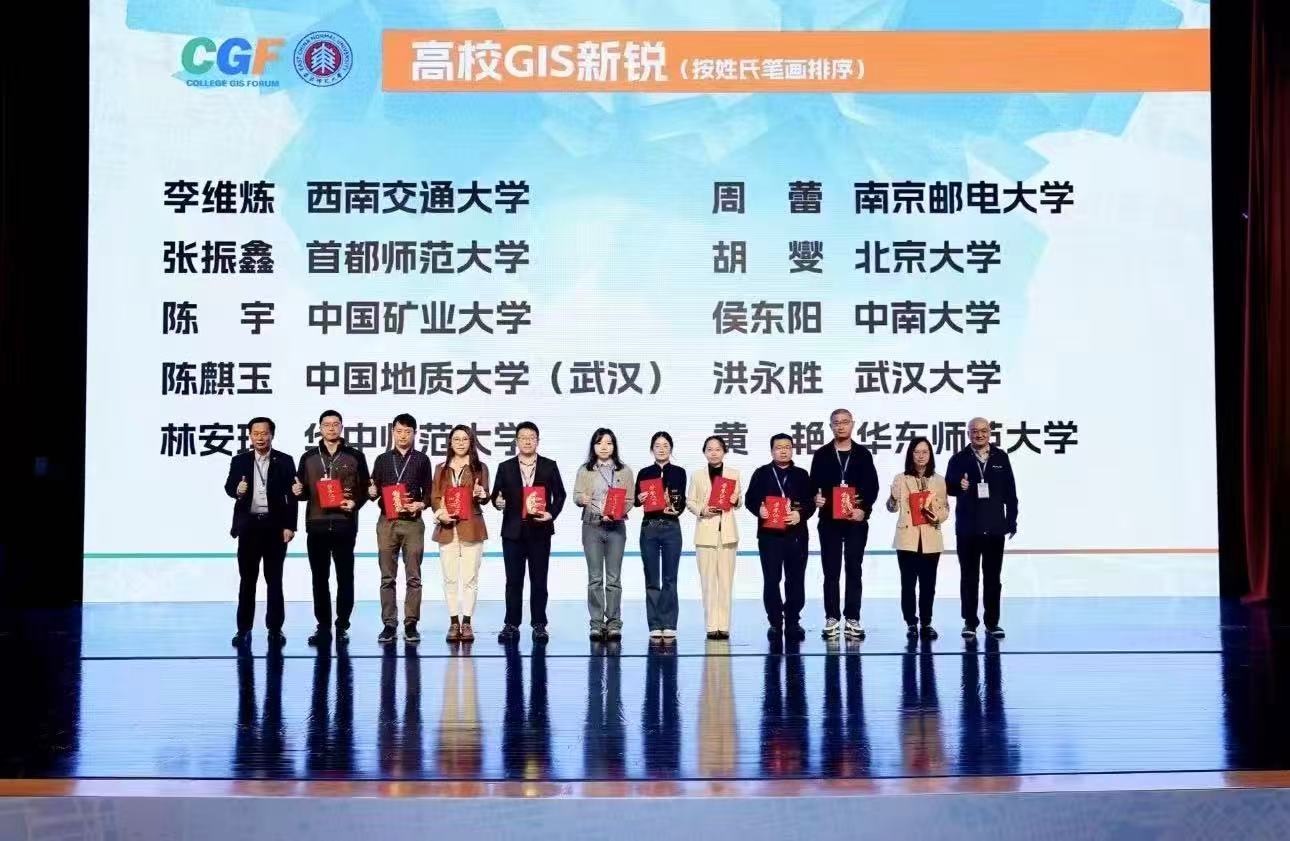 陈宇副教授荣获“高校GIS新锐”奖。该奖项主要面向全国39岁以下在GIS领域的科研与教学中做出突出创新成绩的优秀青年教师。自论坛创办至2023年的十三届以来,全国范围内仅评选出116位“高校GIS新锐”获得者,是我国GIS领域青年人才的重要荣誉,获奖者也多被视为学科发展与行业创新的中坚力量。