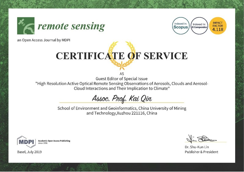 秦凯老师应邀担任SCI学术期刊《Remote Sensing》的(JCR1区,2018年影响因子4.118)客座编辑(Guest Editor),与意大利CNR-IMAA的Simone Lolli博士、台湾国立中央大学Sheng-Hsiang (Carlo) 副教授、美国Naval Research Laboratory的James Campbell博士共同负责以“High Resolution Active Optical Remote Sensing Observations of Aerosols, Clouds and Aerosol-Cloud Interactions and Their Implication to Climate”为主题的专刊(Special Issue)出版工作。