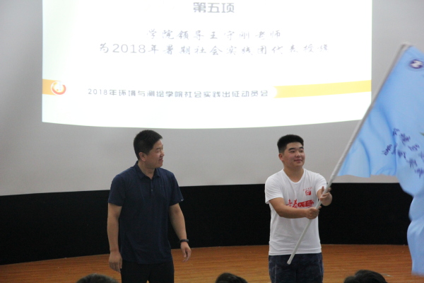 暑期社会实践团出征团旗,并作讲话。他通过介绍一代伟人毛泽东不仅注重自己的学习还特别重视实践的事例,向大家阐述了社会实践的重要性,并倡导同学们将毛主席作为榜样力量和前进的方向。他同时嘱咐同学们在实践过程中一定要学会谦虚和奉献,只有时刻保持谦虚的心态,才能更好地进行历练,才能更快地成长,学会奉献则可以将整个团队凝聚起来,能更好地发挥出团队的力量。最后,王守刚副书记向即将参加暑期社会实践的指导老师和同学提出了殷切的希望,并给予了美好的祝愿。